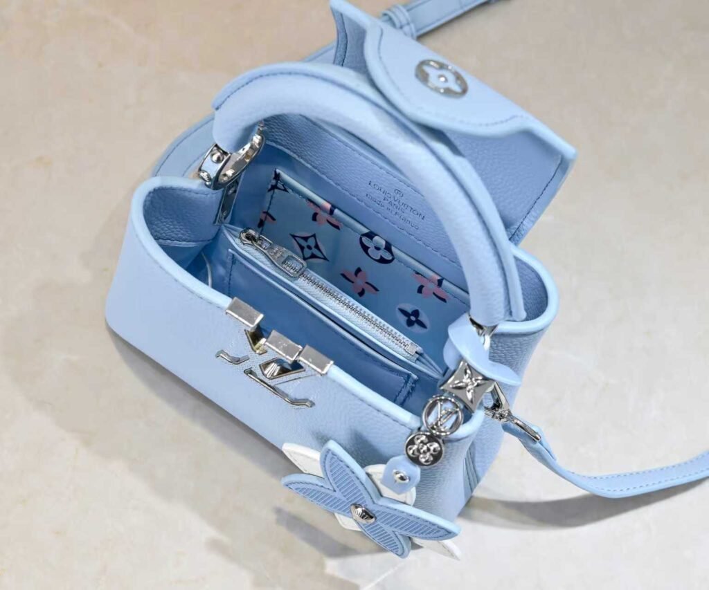 M21416 Blue Flower Pendant Design. This Capucines mini handbag is made of soft Taurillon cowhide. It features a detachable Monogram floral-shaped leather trim to add a contemporary touch. The top handle and detachable adjustable shoulder strap are cleverly used to enable smooth transitions between carrying by hand, over the elbow, on the shoulder, and as a crossbody bag. Dimensions: 21x14x8cm