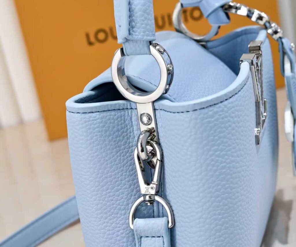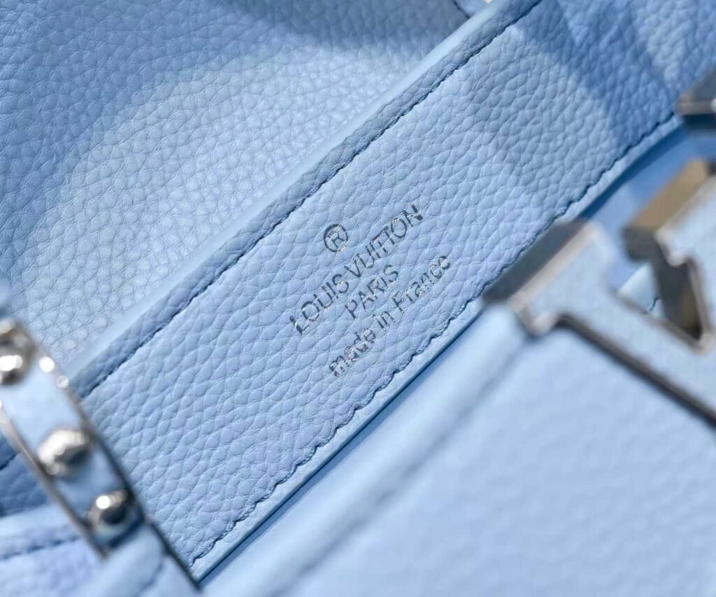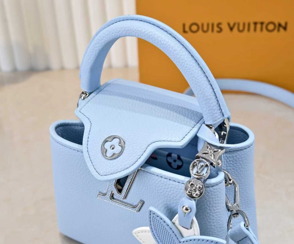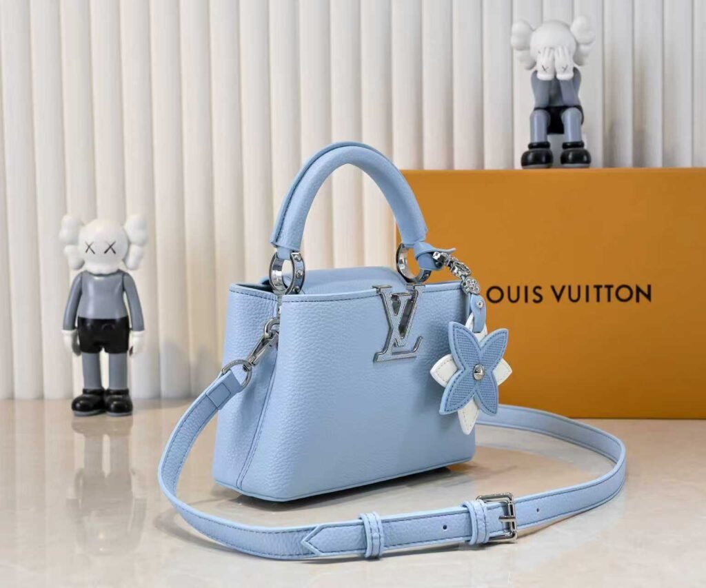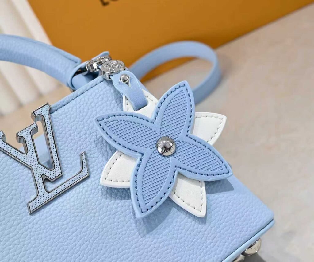 M21416 Blue Flower Pendant Design. This Capucines mini handbag is made of soft Taurillon cowhide. It features a detachable Monogram floral-shaped leather trim to add a contemporary touch. The top handle and detachable adjustable shoulder strap are cleverly used to enable smooth transitions between carrying by hand, over the elbow, on the shoulder, and as a crossbody bag. Dimensions: 21x14x8cm