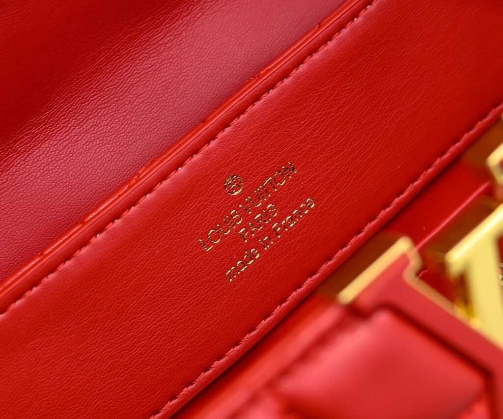 Upgraded version M23999 in red. This Monogram embroidered floral design emerges in the elegant quilting, adding to the Louis Vuitton store decoration style for the Capucines BB handbag. The soft sheepskin creates a stable shape and trim, and the detachable shoulder strap allows for a comfortable shoulder carry or cross-body experience. Dimensions: 33 x 19 x 9 cm