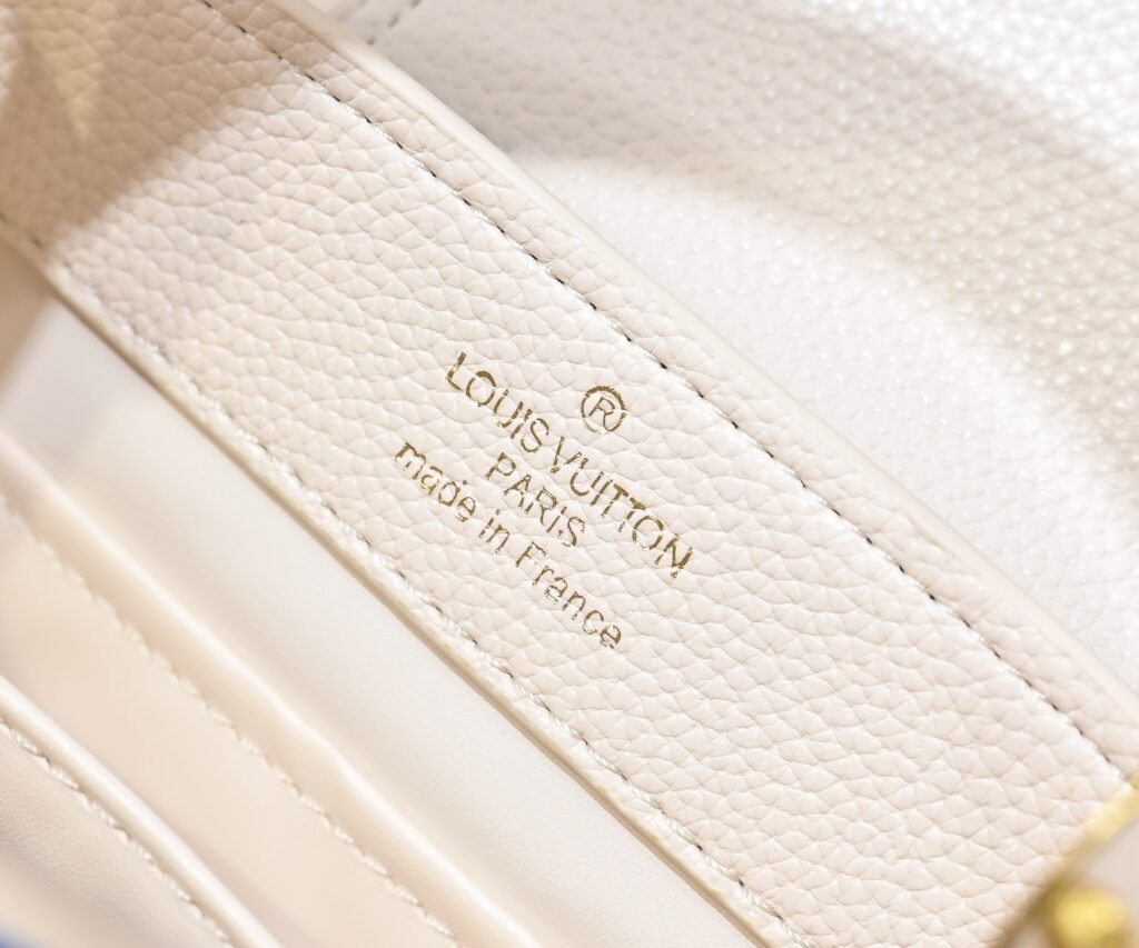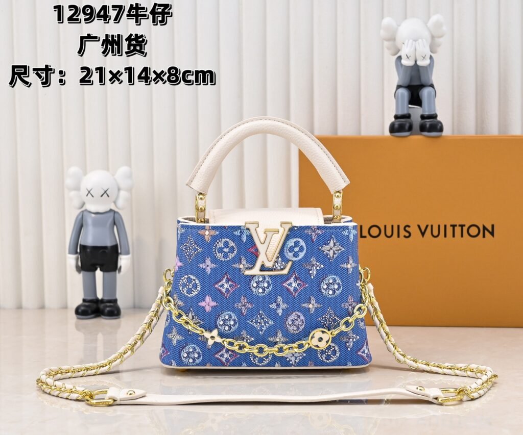 M12947 This Capucines mini handbag is adorned with Monogram denim fabric embroidery, sequins and decorative threads. It is infused with metallic edges through LV letters and braided chains, and features contrasting leather trim. The flap can be either exposed or tucked in, and the neat inner layer and various carrying options enhance the functional details. Dimensions: 21 x 14 x 8.0 cm (length x height x width)