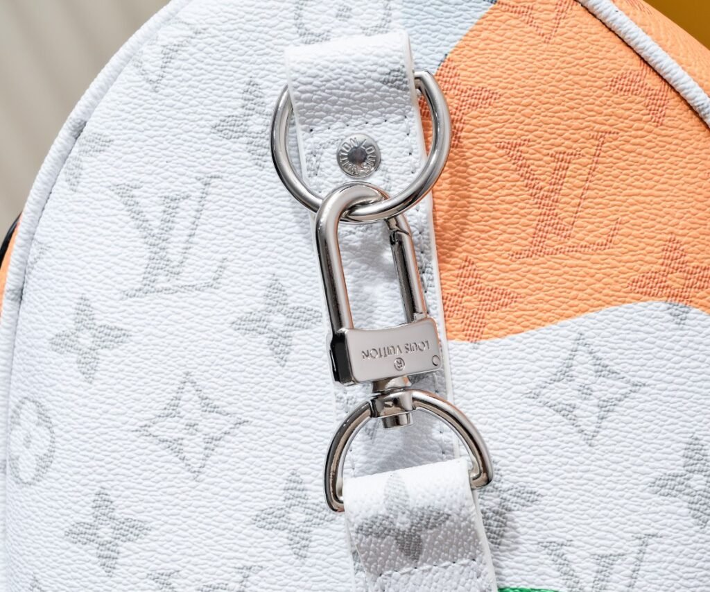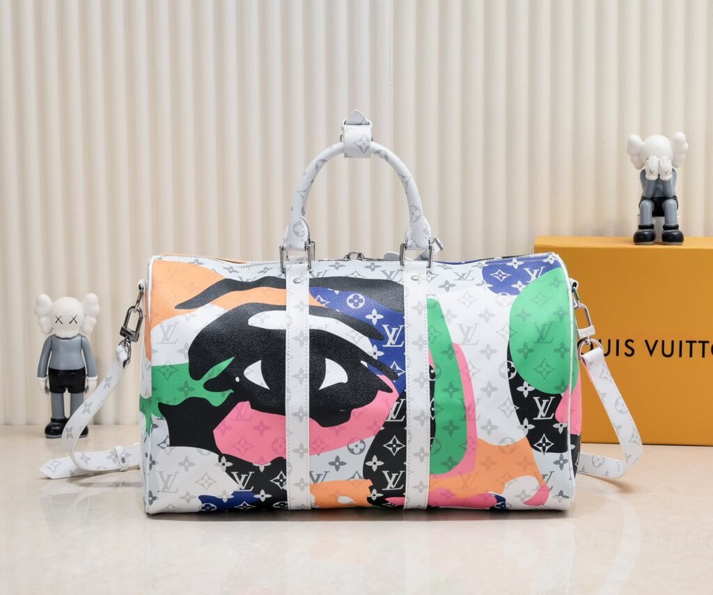 This Keepall Bandoulière 45 travel bag combines Monogram coated canvas and cowhide leather, injecting trendy style into the LV Portrait series. The abstract patchwork pattern on the Monogram design forms mysterious and enigmatic facial contours, and the leather patches on the front and back eyes enhance the three-dimensional effect. Product code: M23160, 41416, 45x27x20 cm (length x height x width). Monogram coated canvas and cowhide leather. Leather trim fabric lining. Metal closure. Abundant capacity with zipped inner pocket. Features eye patches on the front and back. Shoulder strap: detachable and adjustable strap. Half length: 36.0 cm. Adjustable to: 50.0 cm. Handle: double handles.