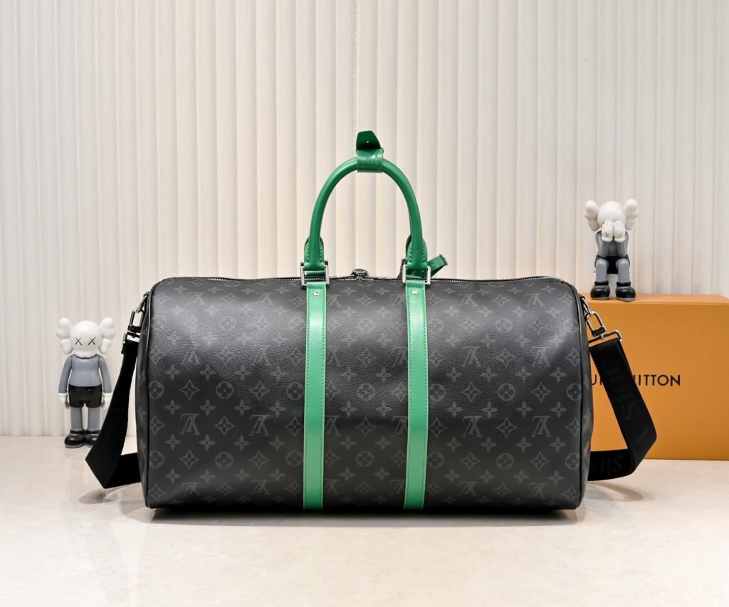 M26434 M41416 This Keepall Bandouliere 50 travel bag is crafted from Monogram Eclipse canvas, with bright side straps and a top handle adding a dynamic touch. Its compact design, combined with a fabric lining and zippered pocket, ensures a convenient and easy carrying experience. A detachable and adjustable shoulder strap allows for shoulder or crossbody wear. Dimensions: 50x29x23cm