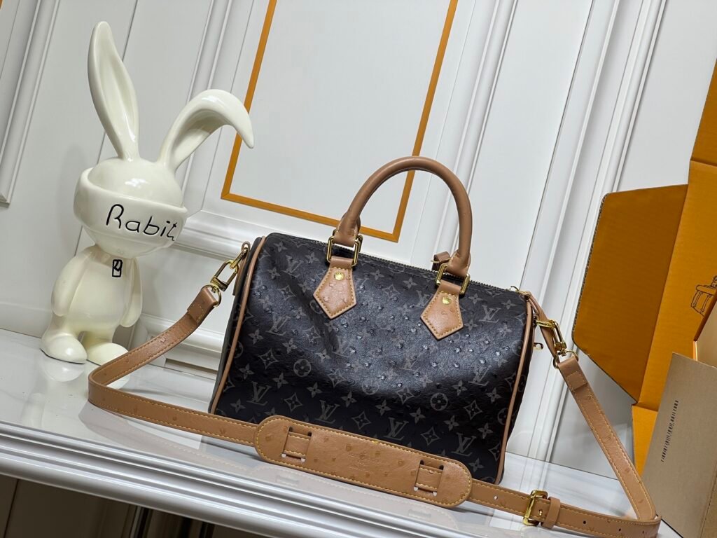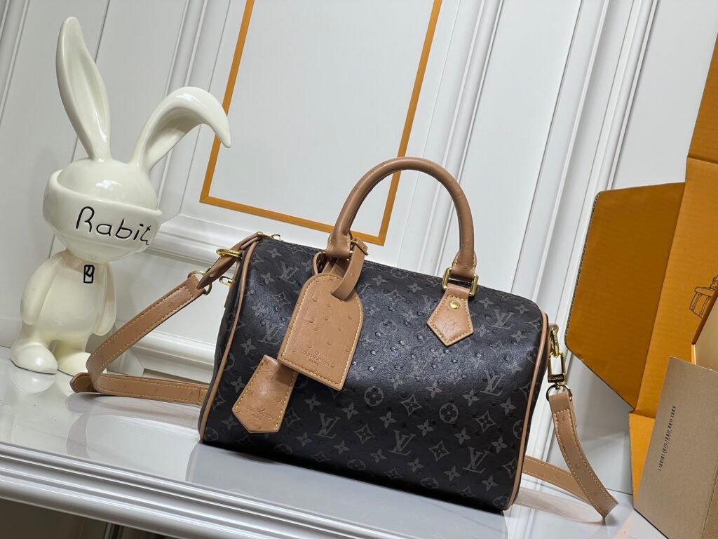 M16282 M16281 M40390 M40391 M24424 M24420 M24433 M88227 This Speedy Bandoulière 25 Monogram Leather handbag is crafted from supple ostrich leather, recreating the sophisticated look of canvas print with the Monogram pattern. Striking hardware, a lambskin lining, and a nameplate all attest to Creative Director Pharrell Williams’ relentless pursuit of detail. 25 x 15 x 15 cm (Length x Height x Width)