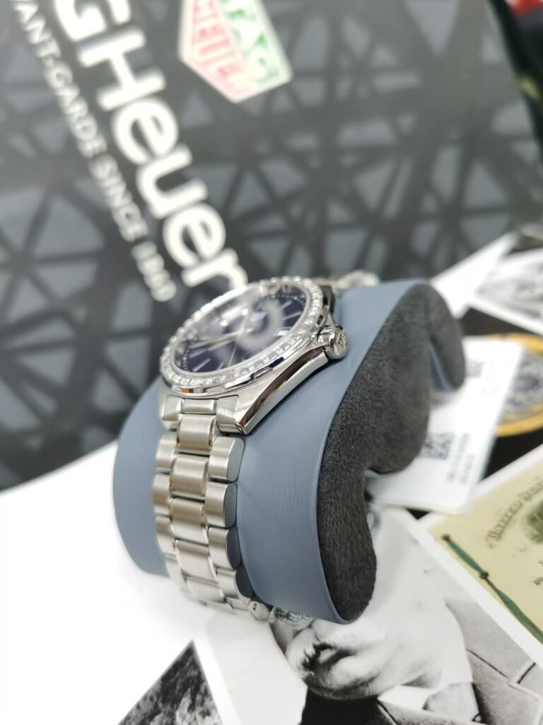 An sunray-brushed dial that changes shade of blue depending on the angle of the wrist. A stunning steel bracelet, hand brushed and polished to gleaming perfection. The dazzling allure of a 36 diamond bezel (0.28 CT). Classic luxury, timeless sporting styl